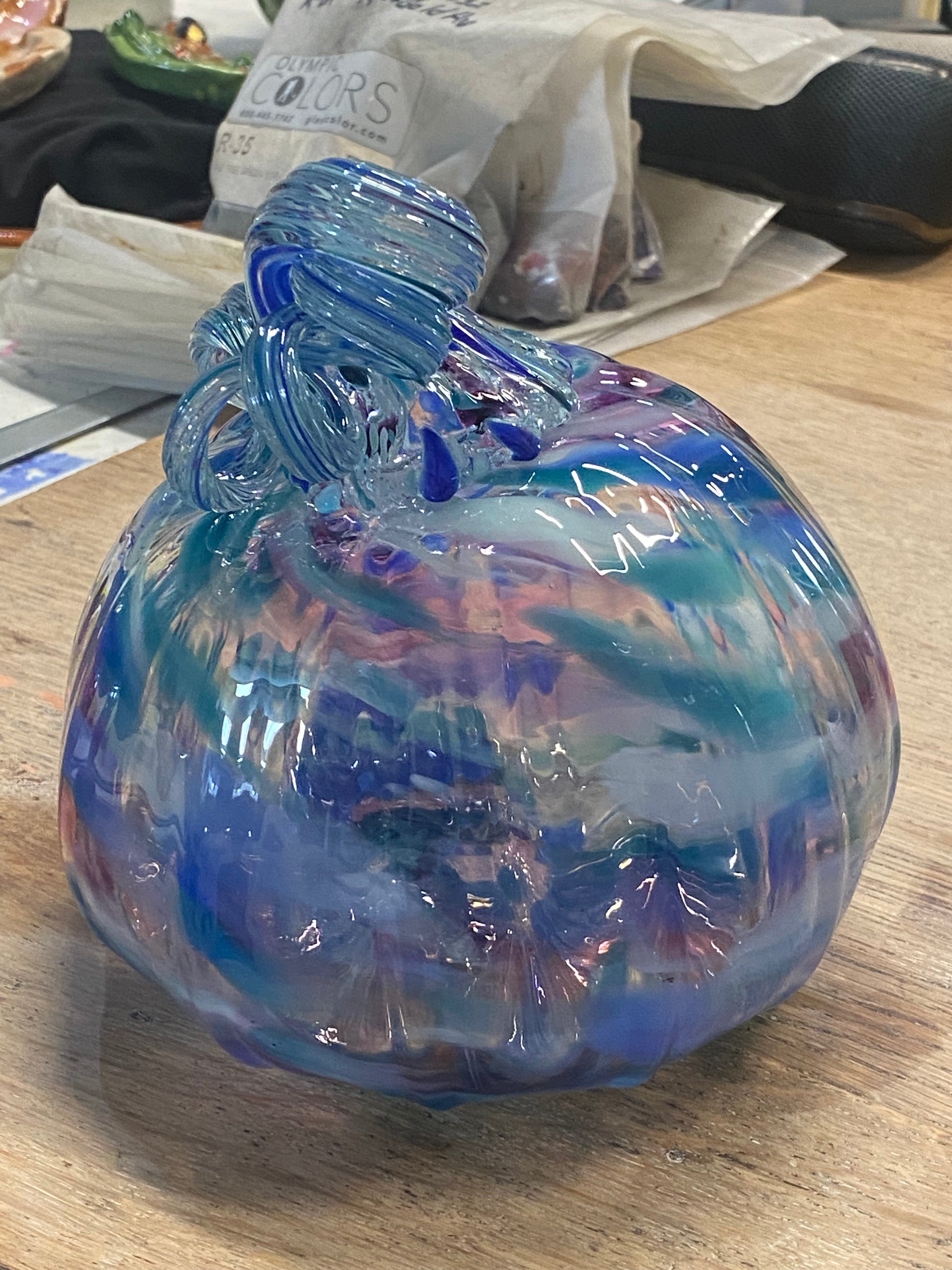 Beautiful blown glass pumpkin with an interesting mix of colors. Made in house by our owner and head glass blower Tammi Ann Ross.
