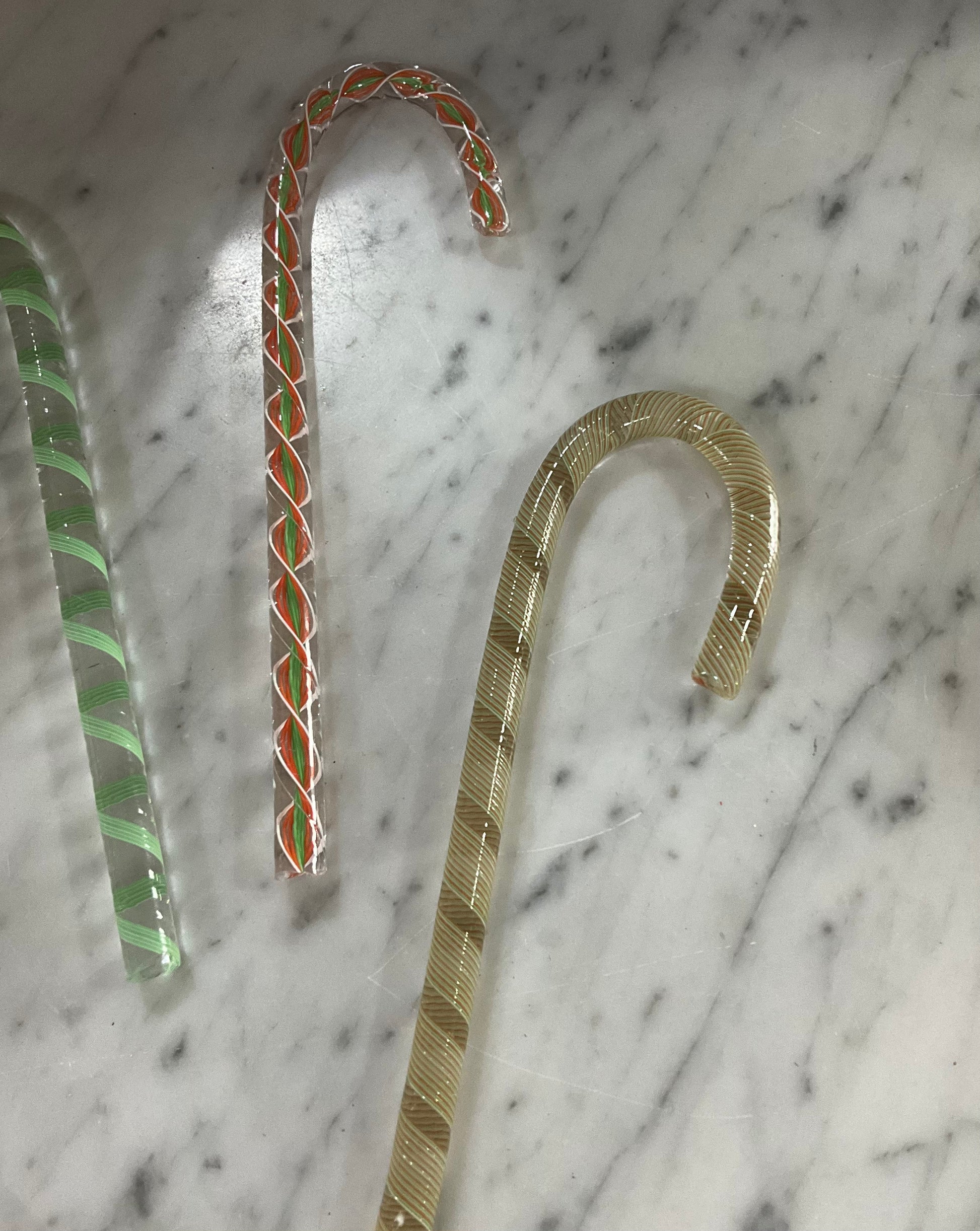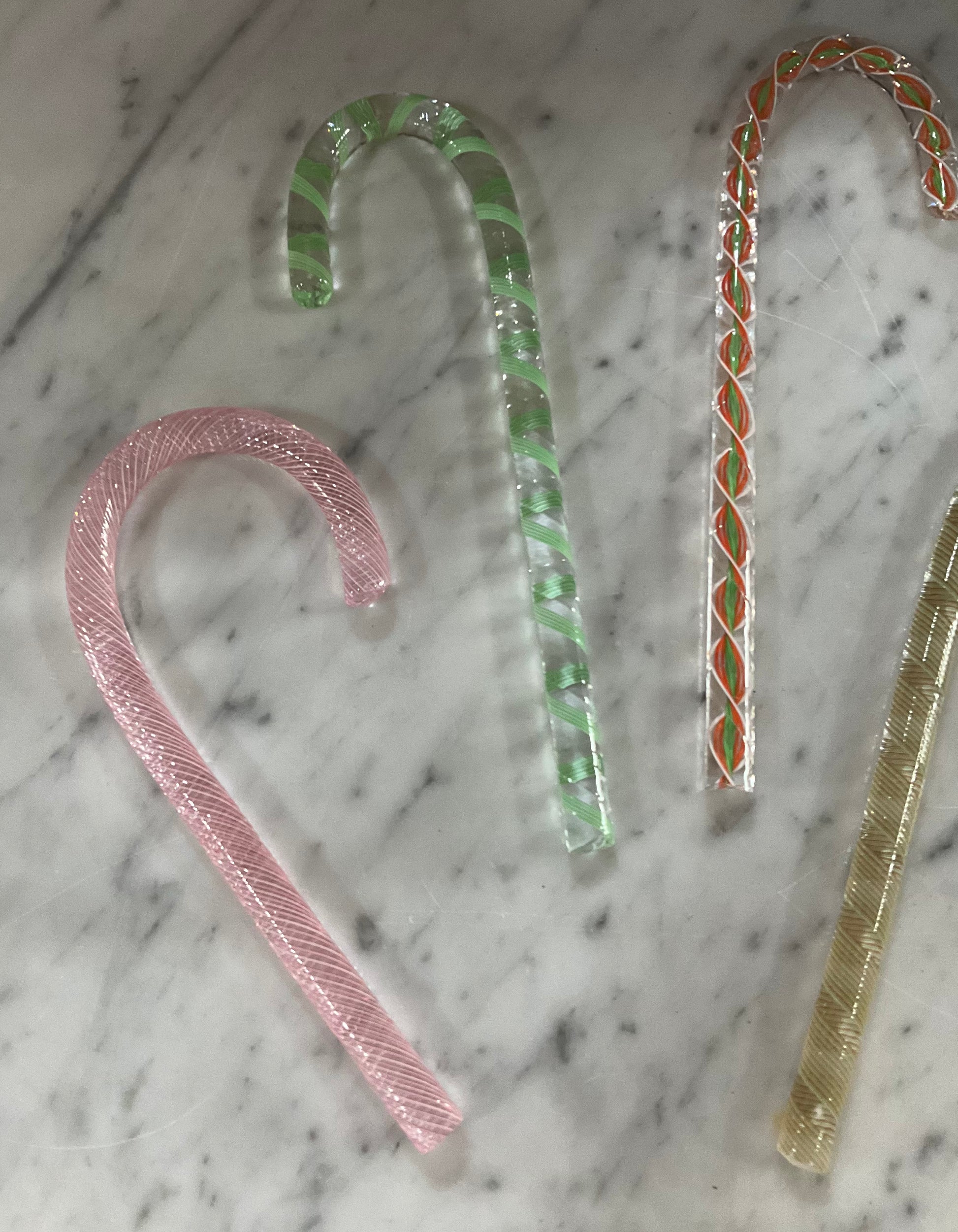 Glass ornaments created from a glassblowing technique called “pulling cane”. These lattachino candy canes make a beautiful and colorful addition to your Christmas tree!