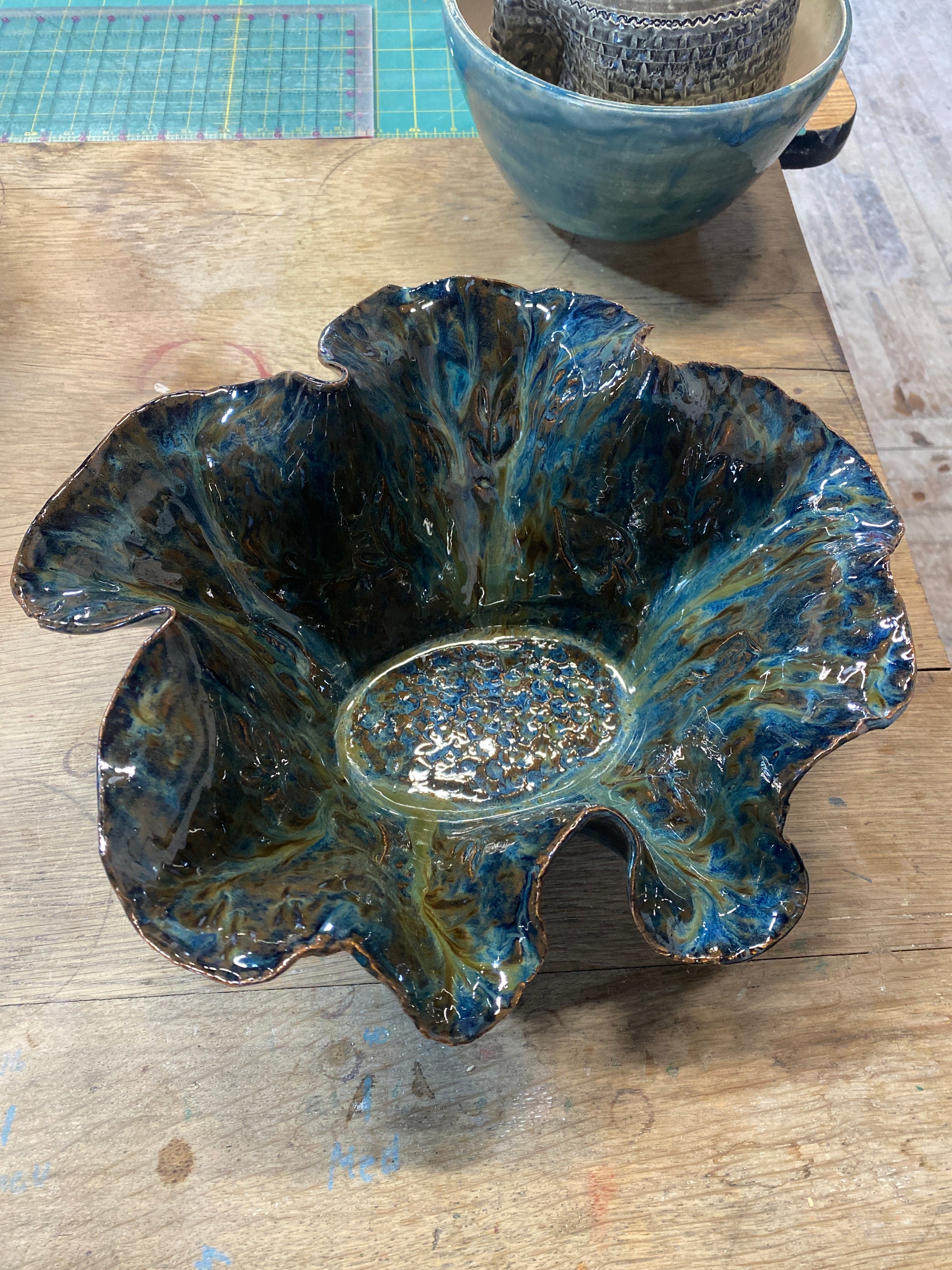 This beautiful hand built sculpture has tones of blue green and brown and is a must see in person piece.