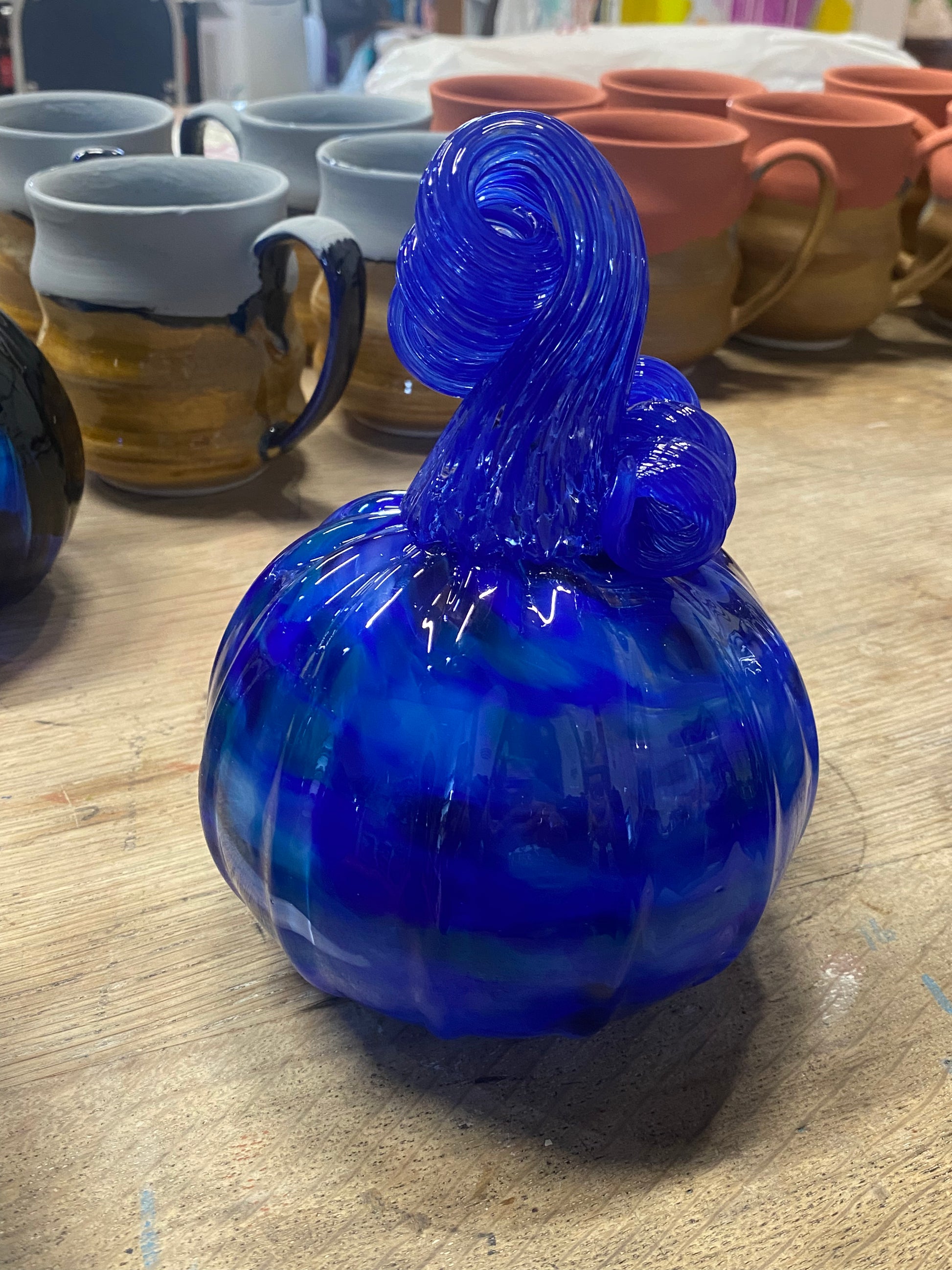 Beautiful blown glass pumpkin with an interesting mix of colors. Made in house by our owner and head glass blower Tammi Ann Ross.
