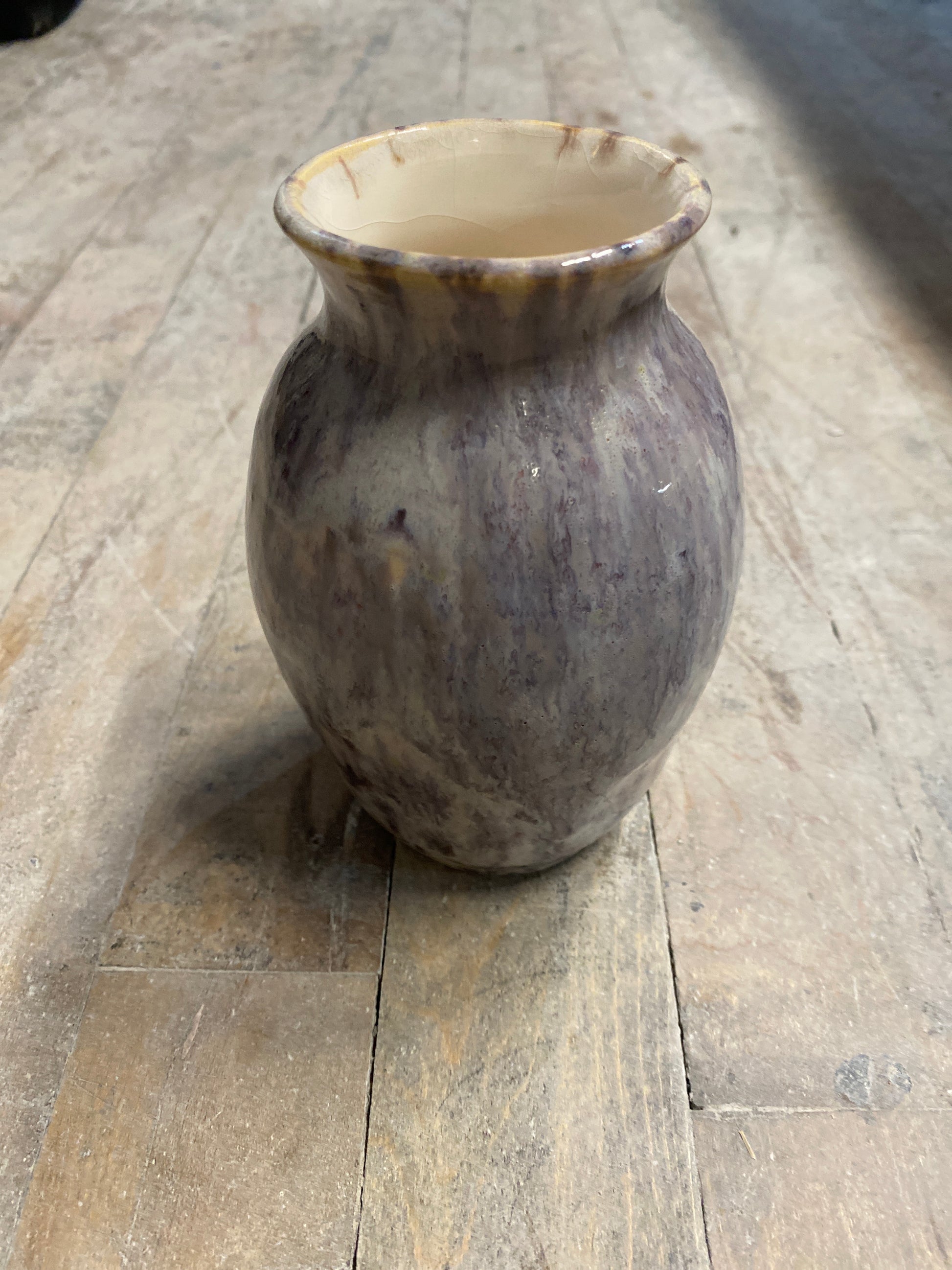 This cute little bud vase has an amazing glaze pattern with cascading runs of lavender flowing softly down the graceful curve of the piece.