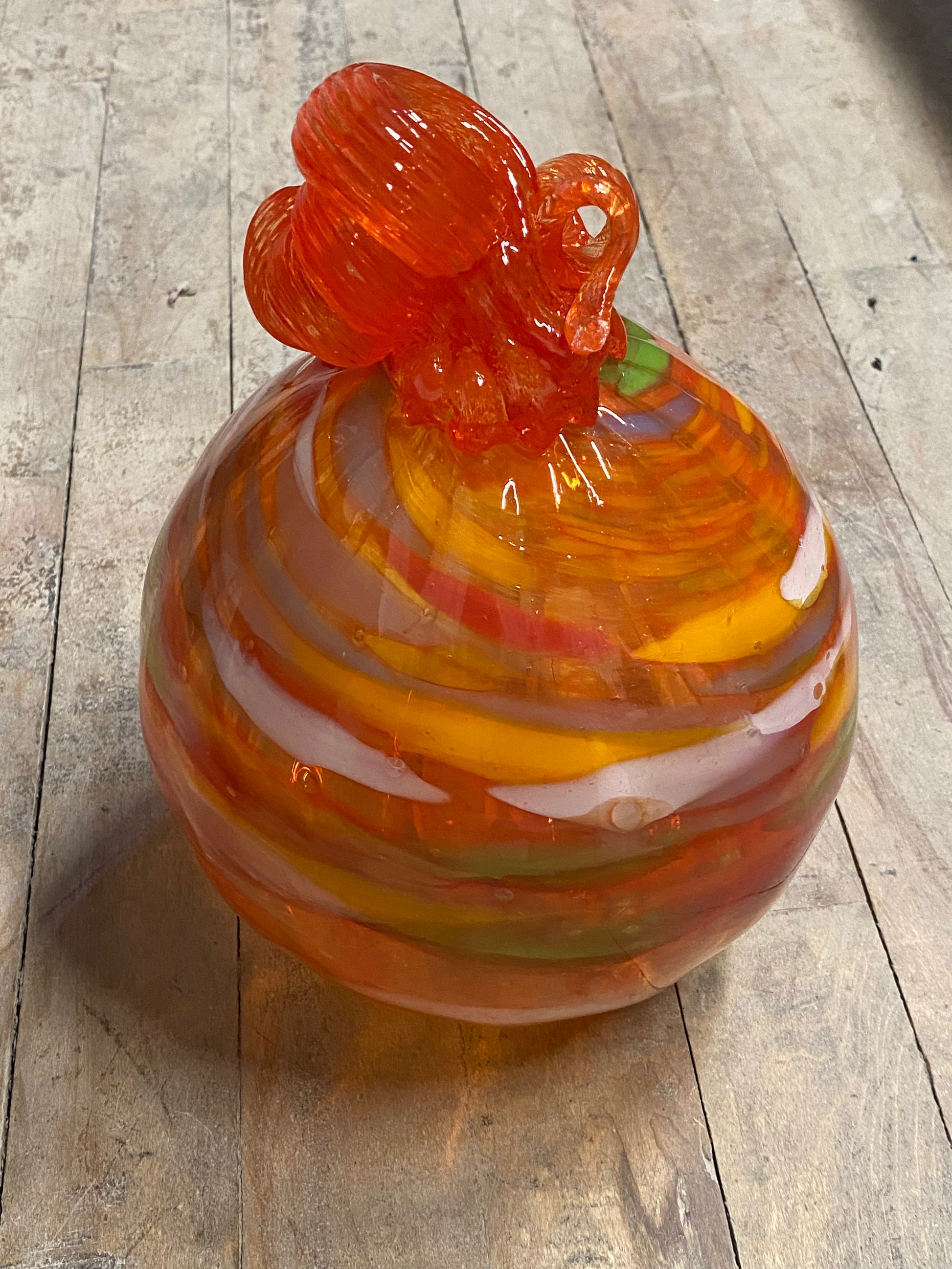 Beautiful blown glass pumpkin with an interesting mix of colors. Made in house by our owner and head glass blower Tammi Ann Ross.
